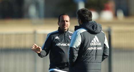 Oscar Pareja chats with Marco Ferruzi at FC Dallas training.